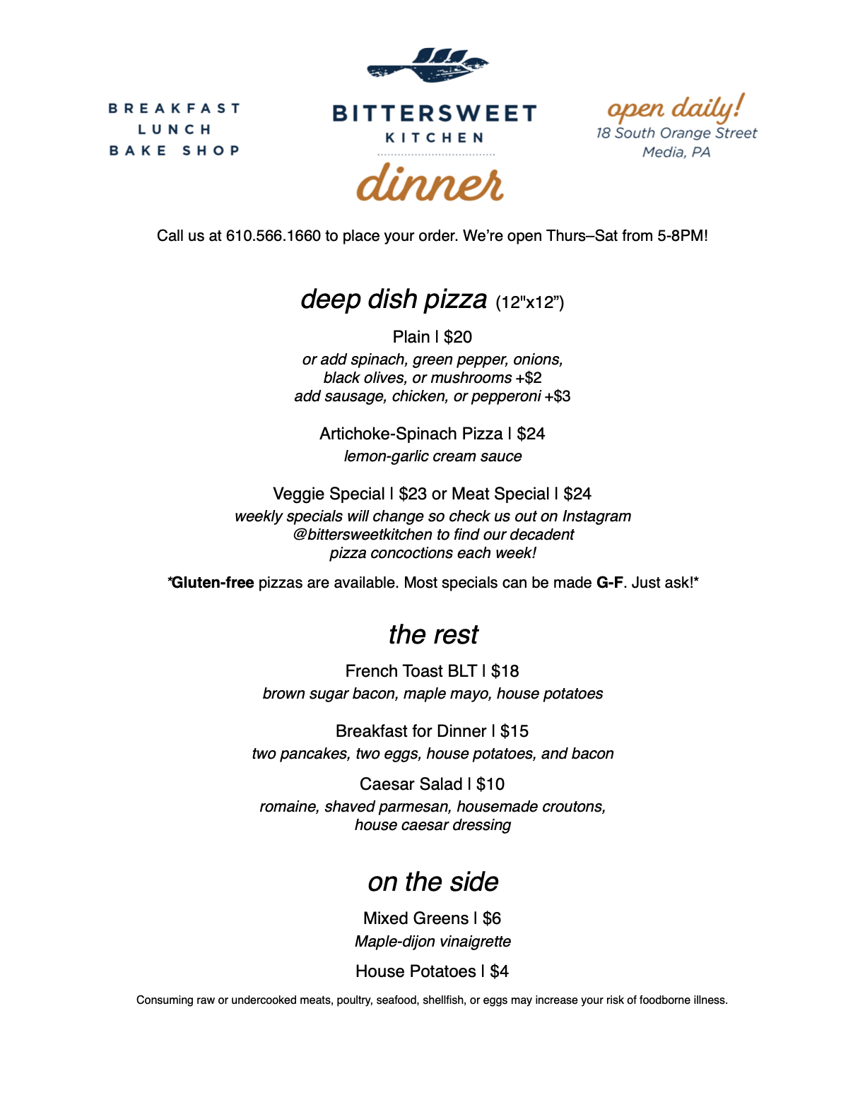 If you wish to order by phone please call 610-566-1660 now! Bittersweet pizza is as good as you would expect from us. Thursday to Saturday (most weeks). Follow us on Instagram for specials and updates.